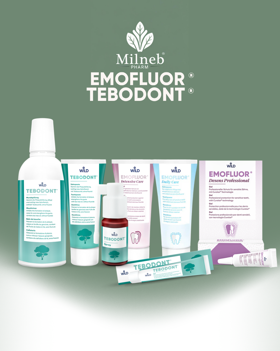 Emofluor linija namenjena je zaštiti i jačanju osetljivih zuba zahvaljujući naprednim fluoridnim formulama, dok Tebodont proizvodi kombinuju prirodno etarsko ulje čajevog drveta sa antibakterijskim i antiinflamatornim dejstvom, čime doprinose očuvanju oralnog zdravlja i ublažavanju iritacije desni.